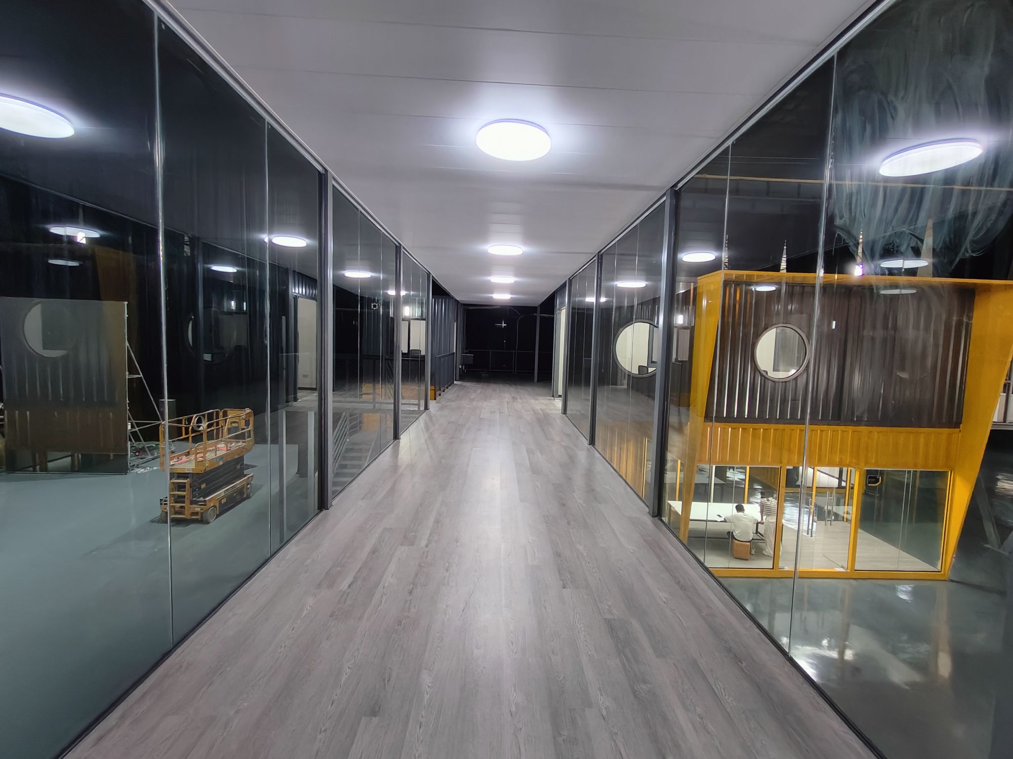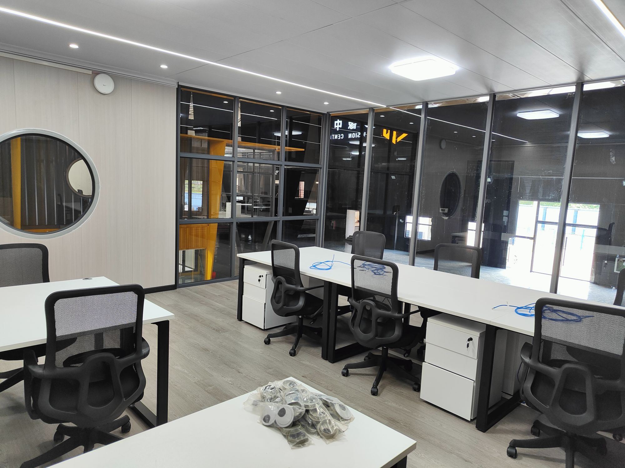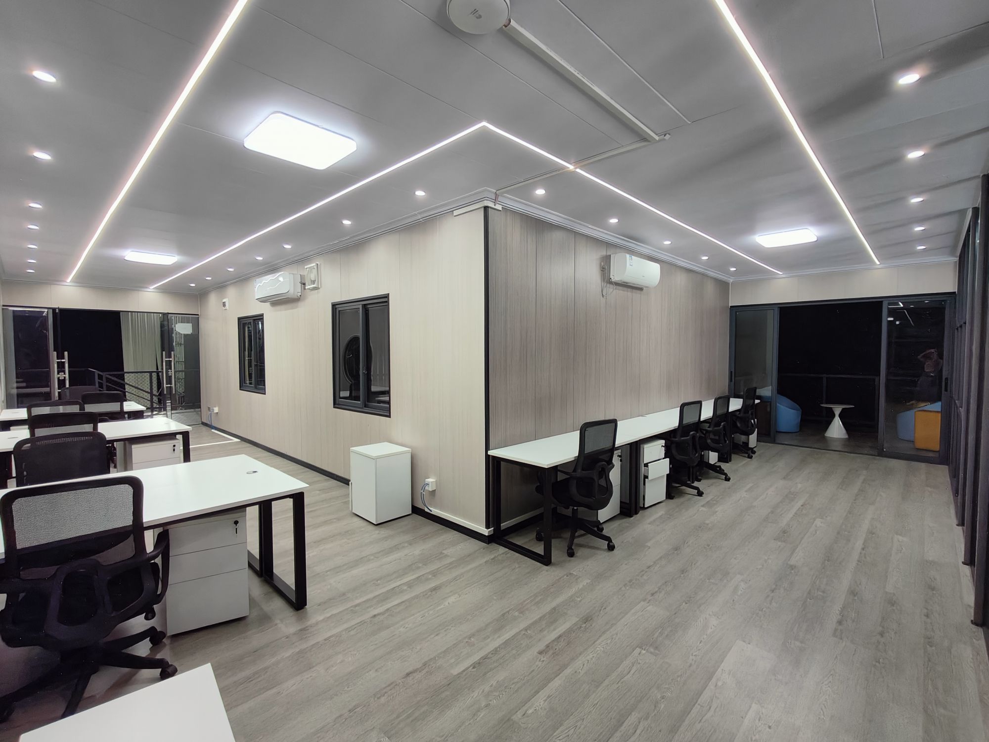全屋配套完善,空调系统、电路布线、隔音内饰全部标准化施工,隔音隔热效果优秀,摒弃传统集装箱建筑简陋粗糙的通病,舒适度对标传统土建写字楼办公环境。大面积高透玻璃隔断,既保证各个独立空间的私密性,又不遮挡采光,空间通透不压抑,视野开阔。