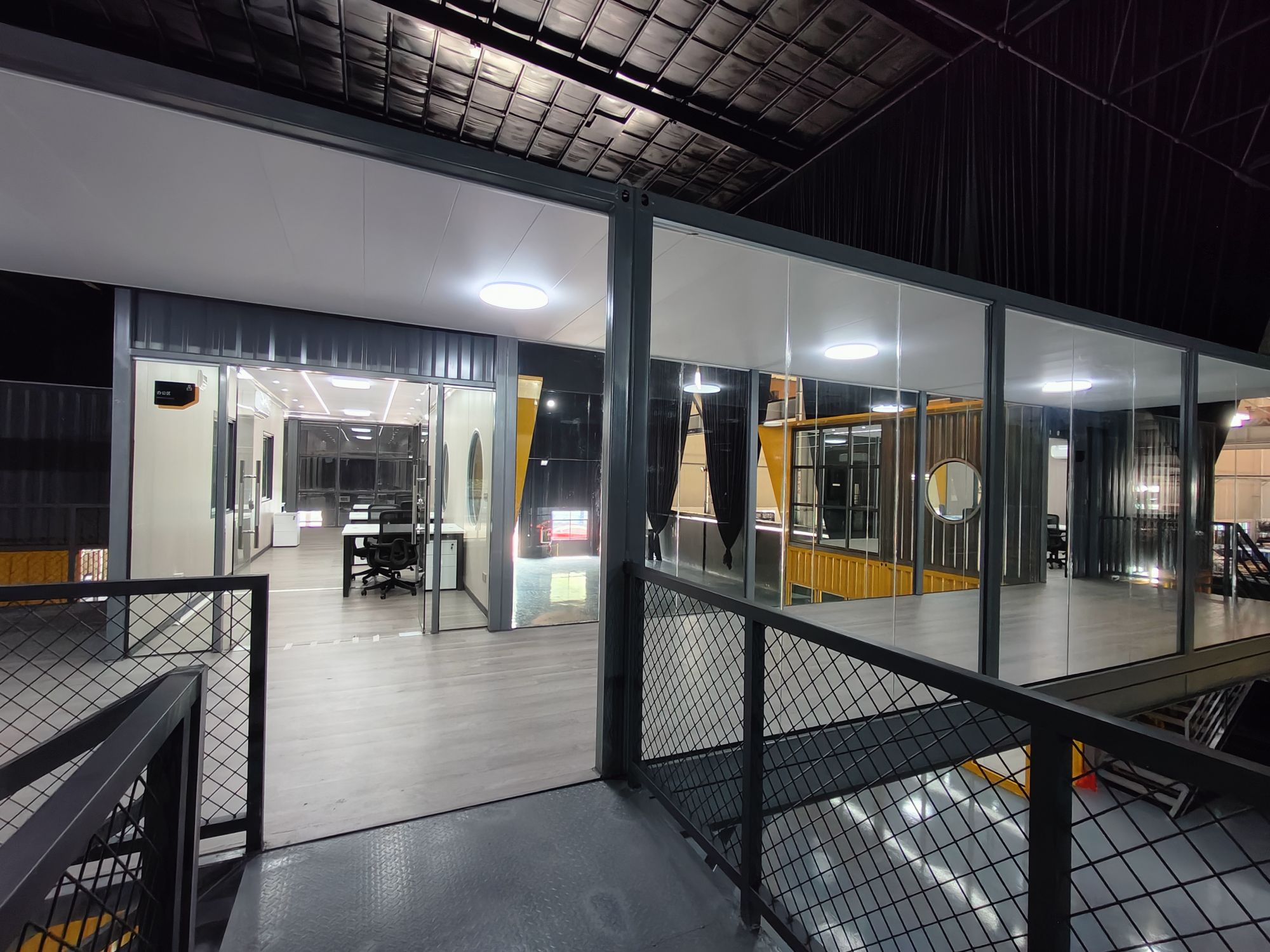 依托成熟的轻钢装配式建筑体系,本次项目充分发挥集装箱建筑搭建快、空间灵活、颜值高级、环保可复用的核心优势,完美适配大型企业园区内的办公空间扩建需求,在大跨度室内场馆内,独立搭建出完整双层办公综合体,空间实用性与视觉质感双向拉满。