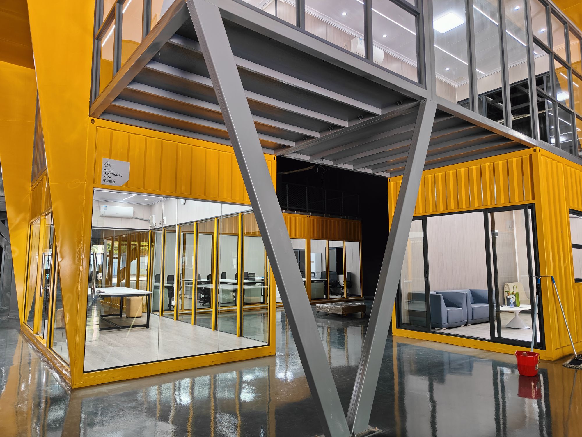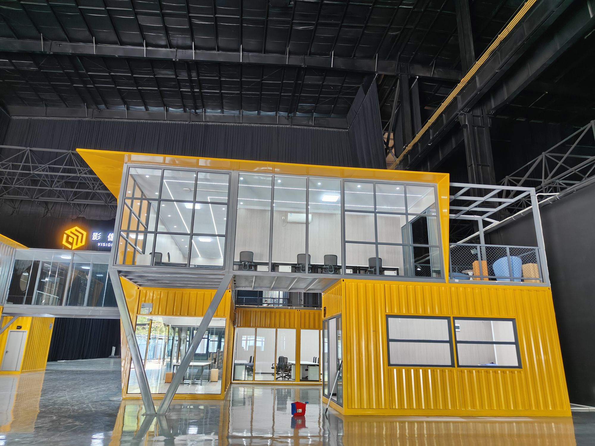 整体建筑采用双层模块化集装箱拼接结构,明黄主体箱体搭配深灰钢结构框架,撞色设计极具视觉冲击力。硬朗的钢结构斜撑、通透全景玻璃幕墙、规整箱体结构、创意圆形窗元素,把工业粗犷感与现代简约美学完美融合。在原本空旷的大空间场馆内部,独立构筑出完整立体建筑体,上下分层、连廊贯通,结构稳固大气,同时完美适配场地环境,与周边空间完美融合。
