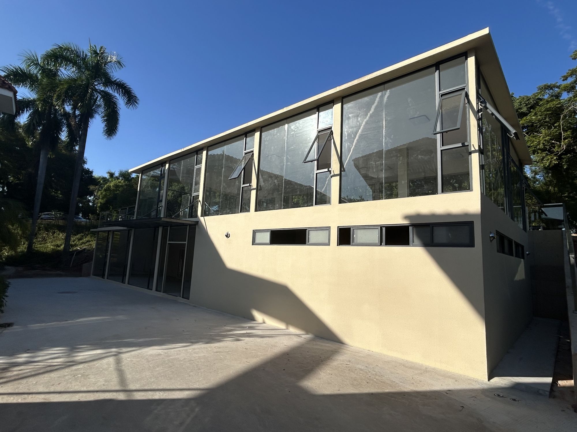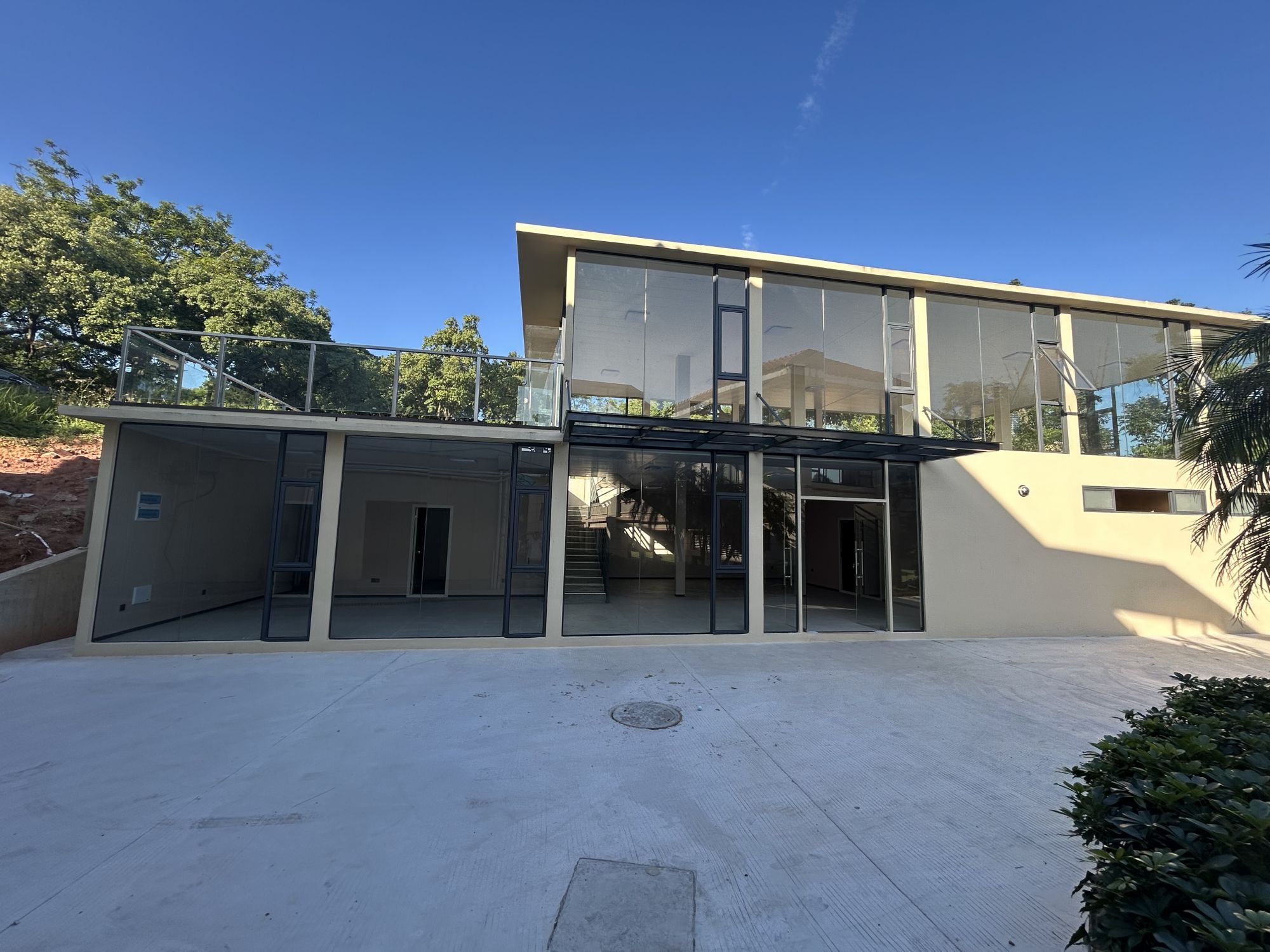颜值适配:大面积玻璃幕墙 + 浅米色外墙,线条干净利落,和蓝天绿树的球场环境融为一体,完全没有突兀感,反而成了一道风景线。