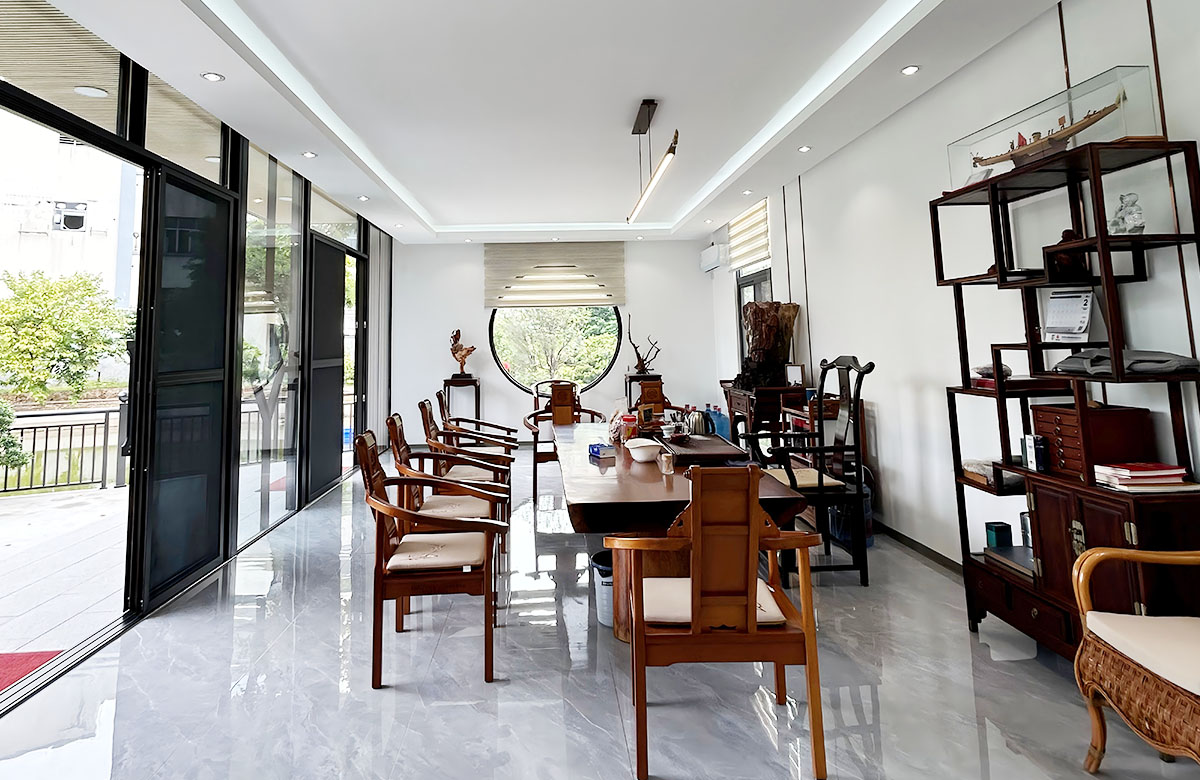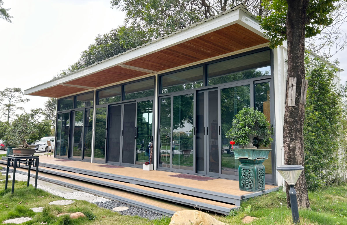 融合中式美学与集装箱结构的创意休闲空间,以热镀锌型材框架为主体,搭配铝单板饰面板 + 碳晶内墙板,内部可规划品茶区、展示区,配置高档铝合金全开折叠门 + 铝合金圆形观景窗,营造静谧雅致的茶文化氛围,是庄园、景区、园区的高端休闲配套。
