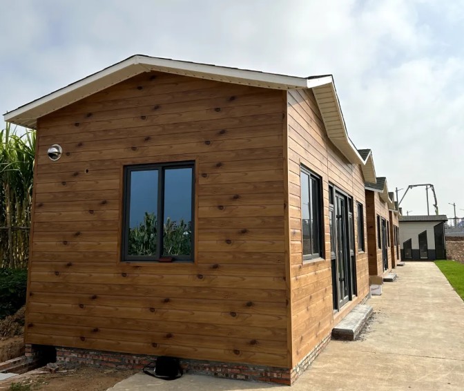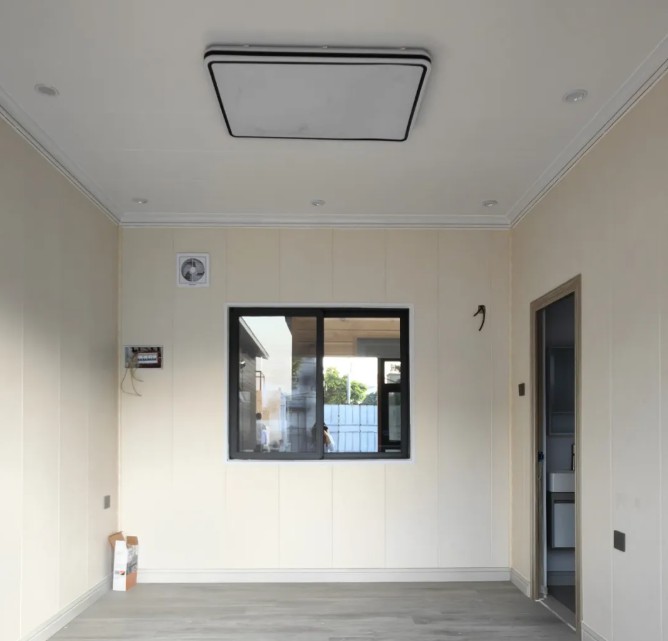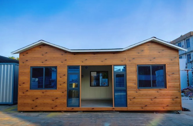 该项目箱体的外观采用仿木纹金属雕花板装饰,屋顶做了人字顶的设计,整体呈现出新中式的风格。其正面配置了铝合金镀膜玻璃门窗,既能保护隐私,又保证了室内的采光性。室内装修简洁明亮,并规划了两室一厅一卫的布局,利用有限的空间打造出舒适且功能齐全的居住空间。