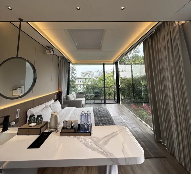 该项目箱体的外观采用仿木纹金属雕花板装饰,屋顶做了人字顶的设计,整体呈现出新中式的风格。其正面配置了铝合金镀膜玻璃门窗,既能保护隐私,又保证了室内的采光性。室内装修简洁明亮,并规划了两室一厅一卫的布局,利用有限的空间打造出舒适且功能齐全的居住空间。