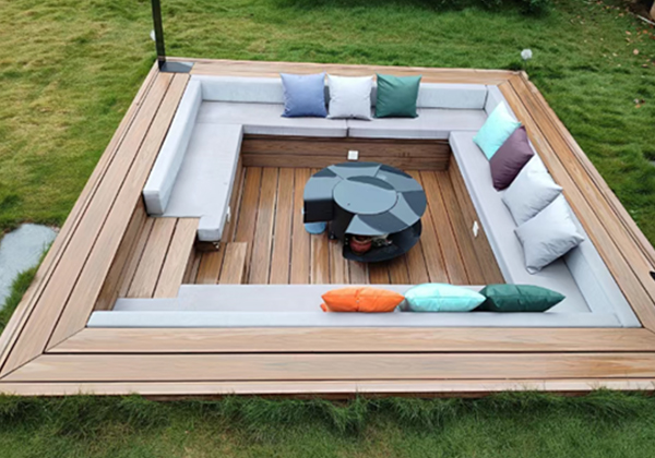 打破了传统户外家具 “悬浮” 于地面的疏离感,用一种 “下沉” 的姿态,可以把人稳稳 “揽” 进自然的怀抱。这样的设计可以轻松容纳多人,无论是家庭聚会,还是好友来访都是不错的聚会场所。