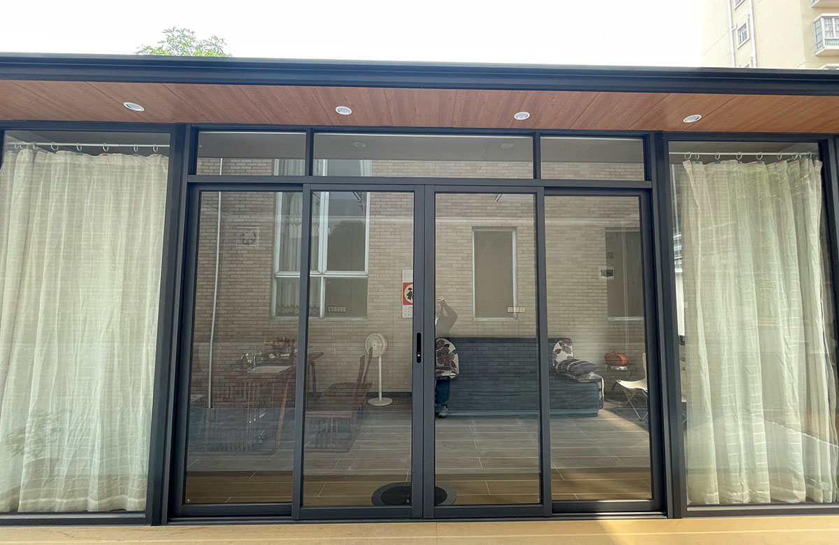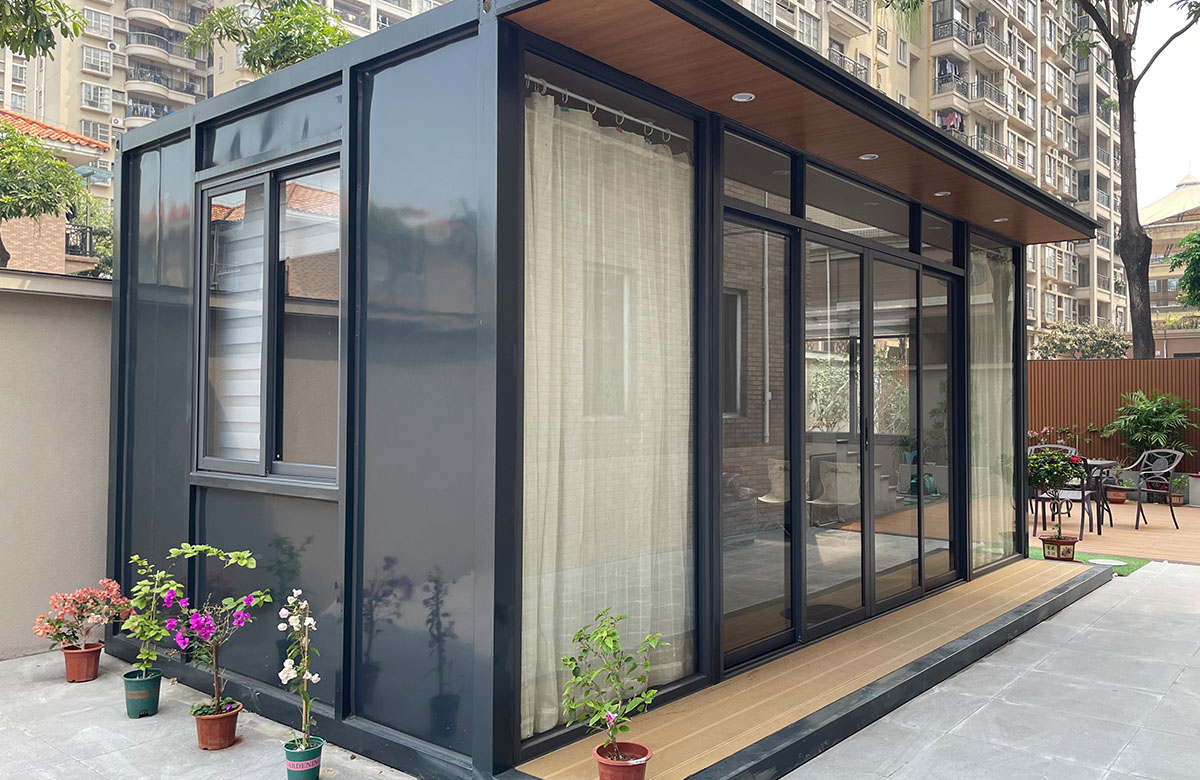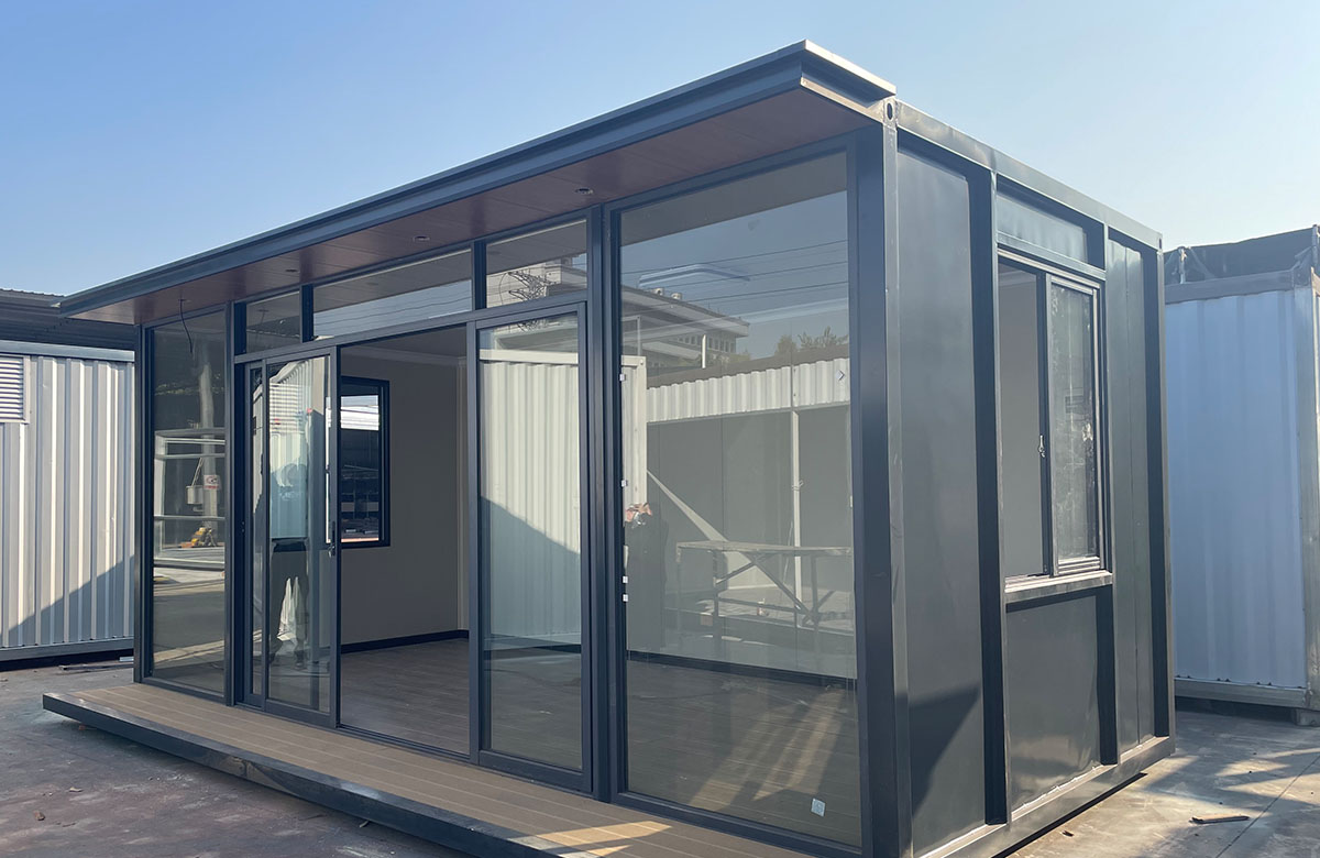 融合中式美学与集装箱结构的创意休闲空间,以热镀锌型材框架为主体,搭配铝单板饰面板 + 碳晶内墙板,内部可规划品茶区、展示区,配置高档铝合金全开折叠门 + 铝合金圆形观景窗,营造静谧雅致的茶文化氛围,是庄园、景区、园区的高端休闲配套。
